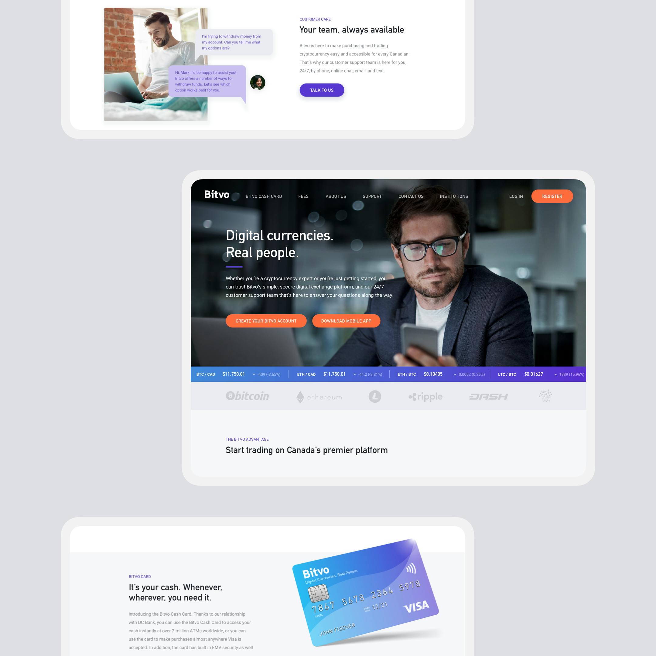 Bitvo is a market-leading Canadian cryptocurrency exchange. We worked with them to develop the brand and created a vision for the web and mobile experiences. We designed and built a platform that instills trust in their customersâin a technically-dense and often-confusing industry.